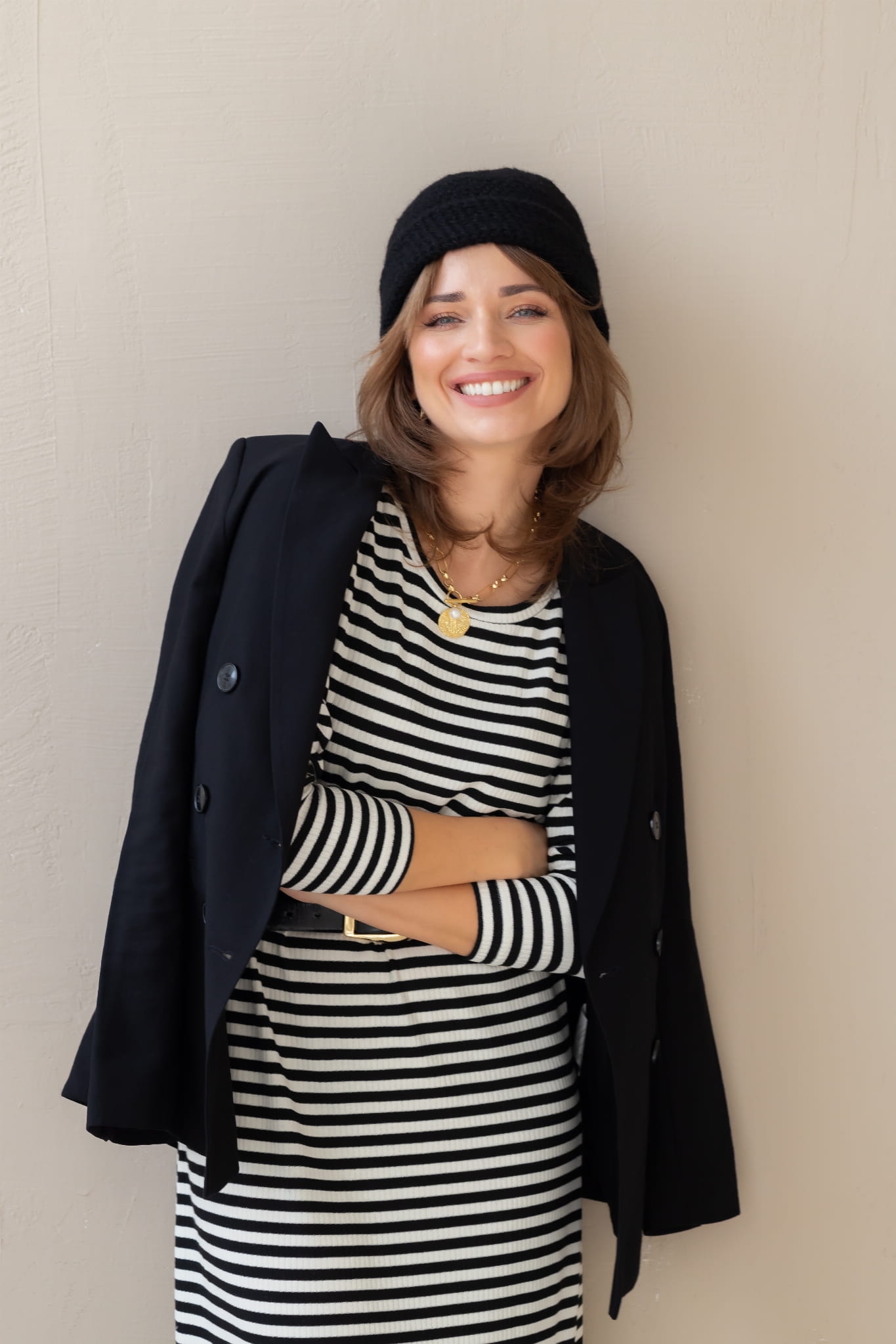 Element z zamszowej ekoskóry przy czapce jest zamocowany na skręcany nit, można go ręcznie odkręcić. Po wywinięciu powstaje czapka typu smerfetka.