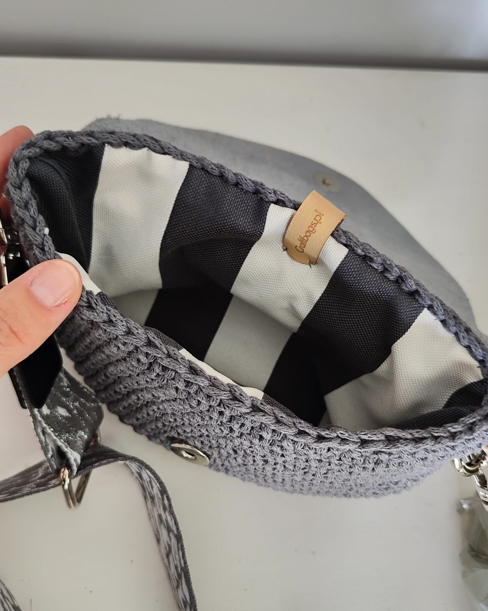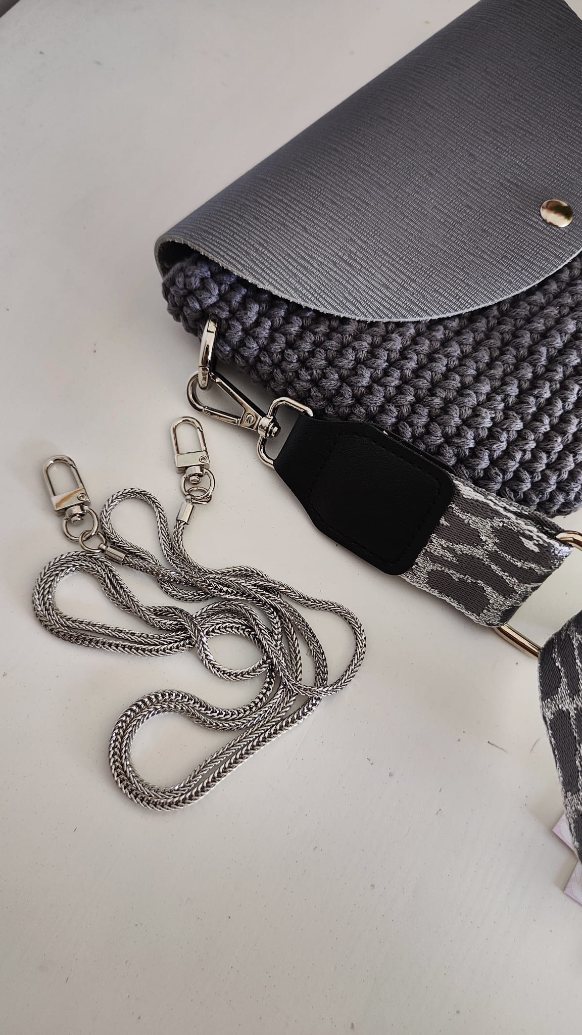 Torebka posiada ozdobny, regulowany pasek oraz dodatkowy, srebrny łańcuszek.