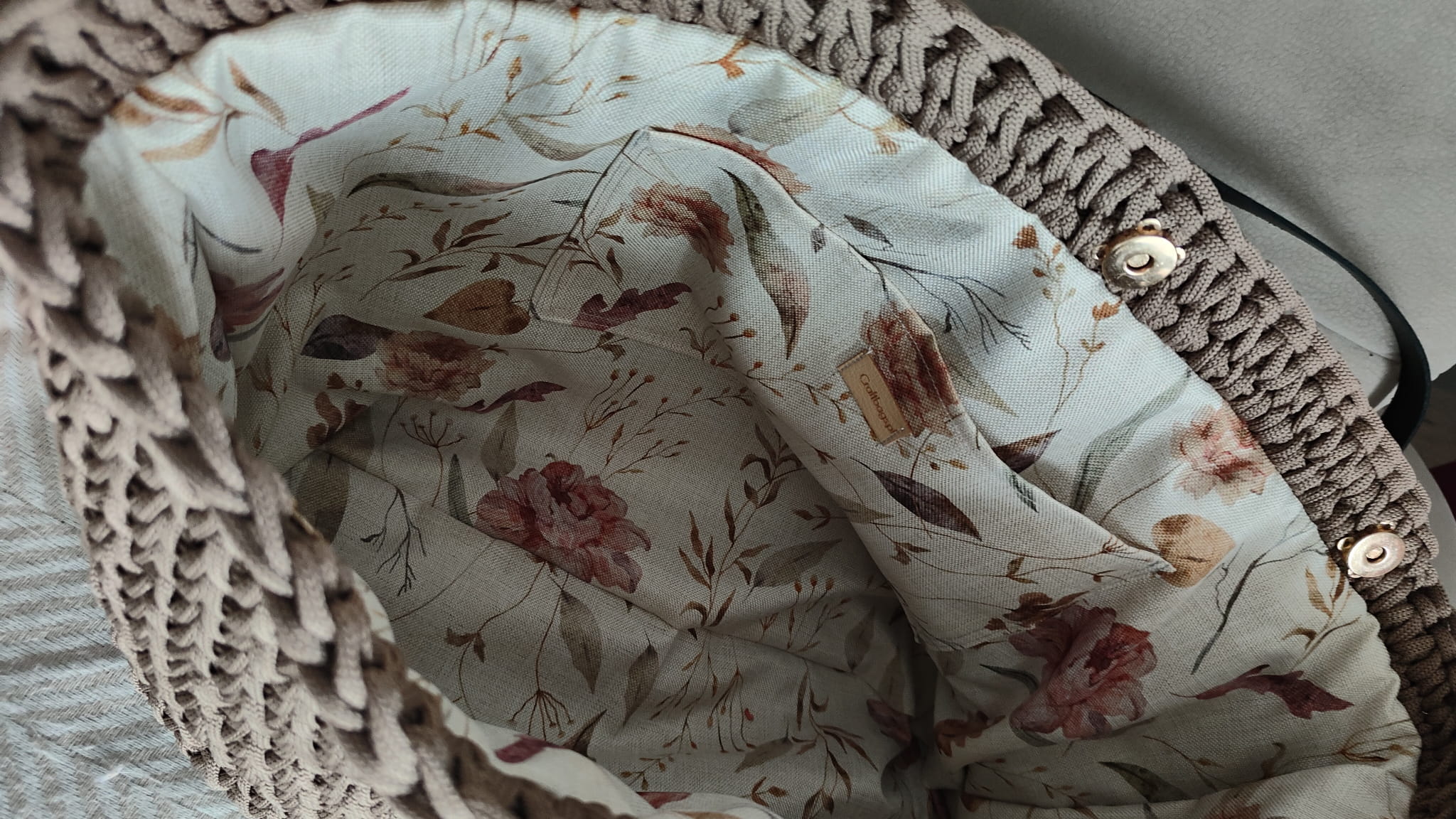 W środku podszewka z kieszonką na drobiazgi. Torebka zapinana na magnesy.