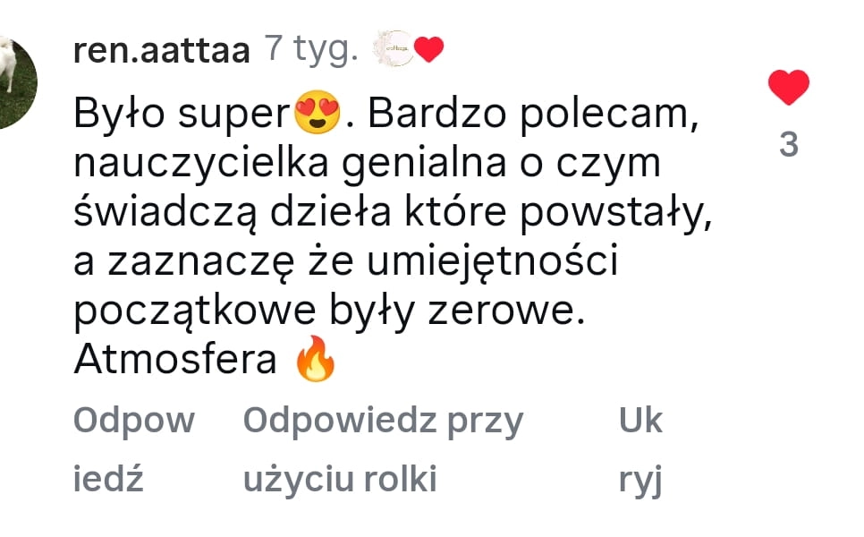 - domowej atmosfery (pracownia mieści się w przytulnym i cichym mieszkaniu z pięknym widokiem na tereny zielone)